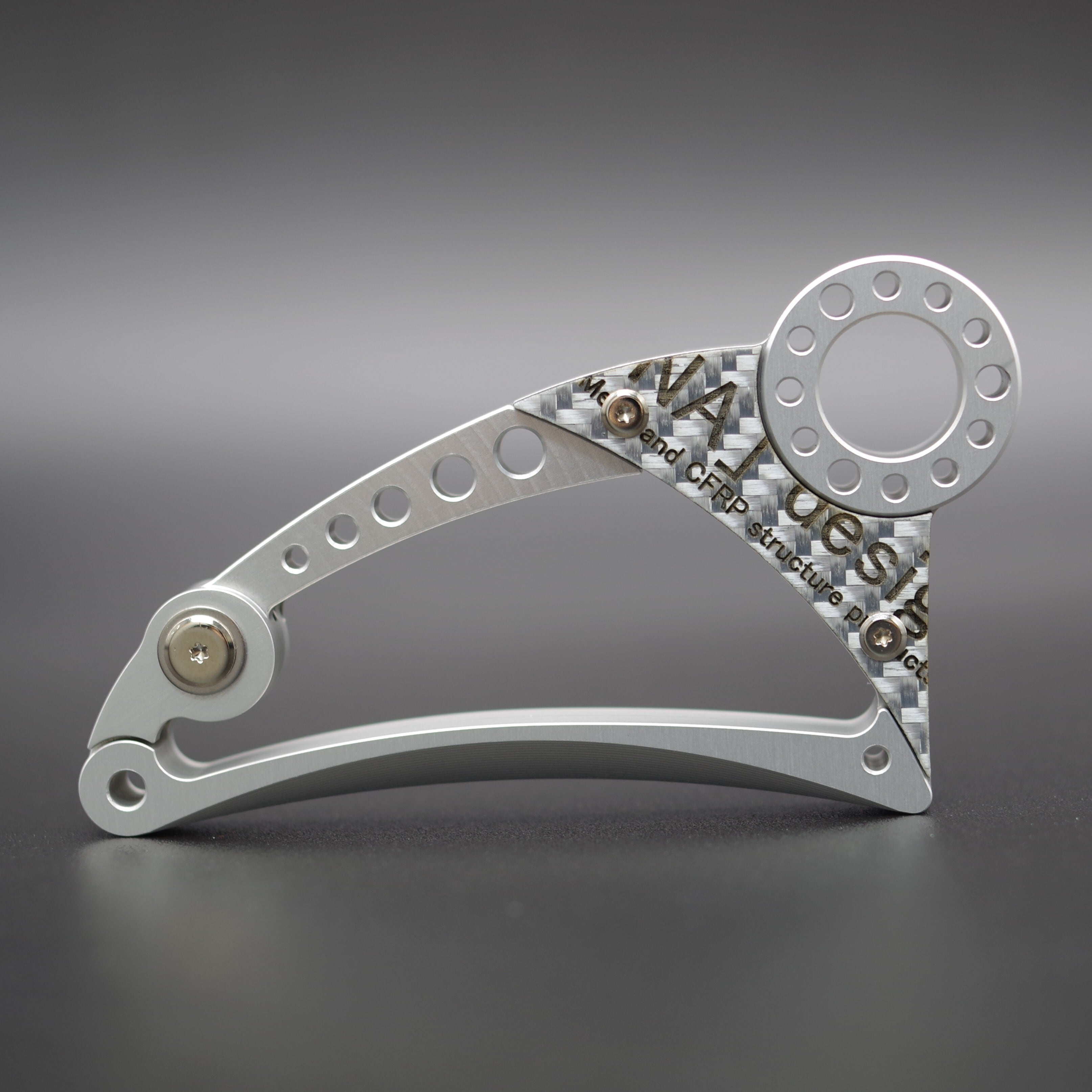 通常、化学研磨したアルミパーツにCFRPプレートを組み合わせるところ、アルミパーツに白アルマイトを施しています。