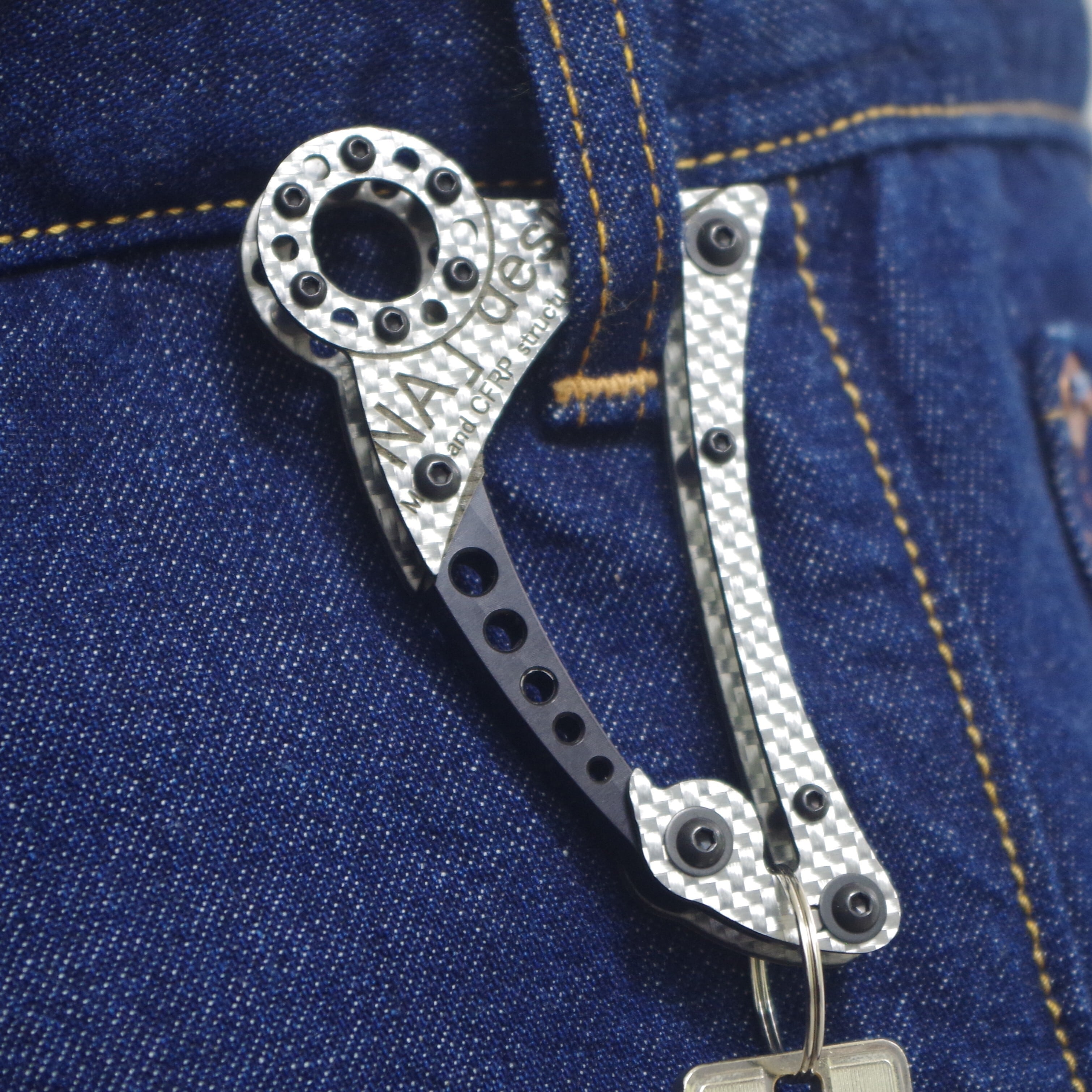 従来のMetal key Holderと基本デザインはそのままに、本体部分の2枚のCFRPプレートを13本のボスで繋ぐ、新設計のCFRP Key Holder SLW。同じデザインを踏襲しつつも、構造、素材が変わる事で、だいぶイメージの違う商品となりました。また従来品も25gという軽い重量を実現していましたが、今回のCFRP Key Holder SLW(SLWはSuper Light Weightの略)は、従来品同等の寸法、高剛性を保ちながら、重さはわずか14g!!CFRPならではの驚異の軽さ、高剛性を、是非お試しください。